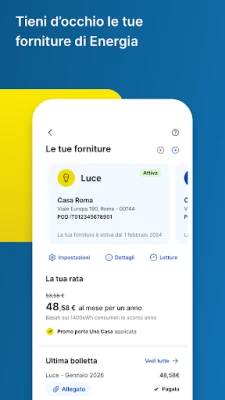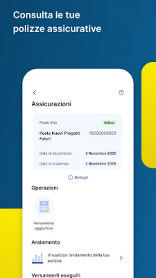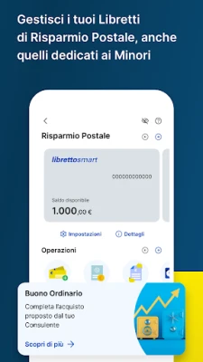 Recupera tempo prezioso eliminando le attese in Ufficio Postale: prenota il tuo appuntamento e prepara le operazioni comodamente in anticipo. Utilizza Postepass per un'identificazione rapida e localizza l'Ufficio Postale più vicino con un tocco. Per il tuo futuro, apri e gestisci Libretti Smart, Buoni Fruttiferi Postali e Depositi Supersmart, monitorando i tuoi obiettivi di risparmio. Prenditi cura di te e della tua famiglia con il check-up assicurativo di Poste Protezione, monitora gli investimenti e gestisci richieste di rimborso. Controlla la tua fornitura luce e gas con Poste Energia a rata fissa, gestisci la tua SIM PosteMobile e i dettagli della linea Fibra PosteCasa Ultraveloce. Personalizza l'app, riorganizza la tua home e abilita notifiche su misura per un'esperienza fluida e informata, sempre protetta da passkey, impronta digitale o FaceID.