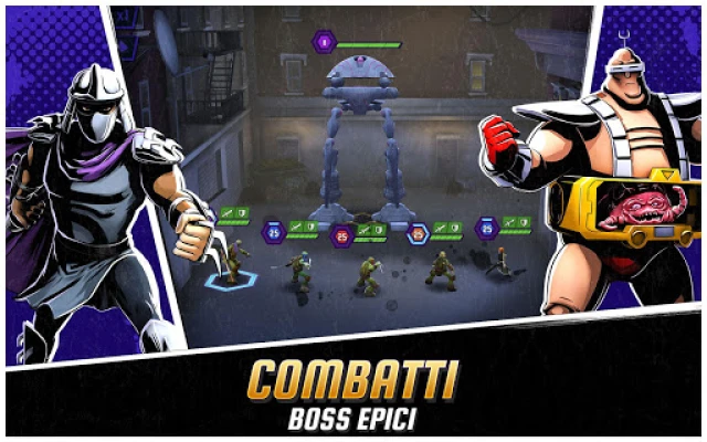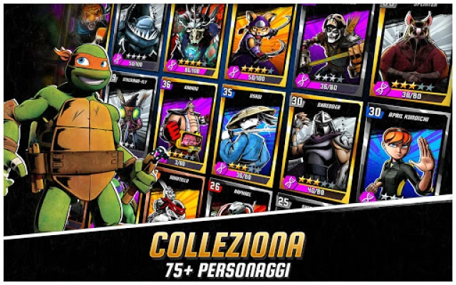 Prepara la tua squadra definitiva sbloccando e potenziando più di 30 personaggi iconici dell'universo delle Tartarughe Ninja. Da Splinter a April O'Neil, fino ai più temibili avversari come Tigerclaw, Rocksteady e Bebop – per la prima volta, avrai l'opportunità di schierare anche i nemici storici al tuo fianco per combattere i Kraang! Ogni mutante possiede mosse uniche e abilità spettacolari da scoprire e migliorare. Costruisci formazioni strategiche, affina le loro super mosse e domina i campi di battaglia più iconici della serie, dalle caotiche strade di New York alle profonde fogne, fino alla minacciosa Dimensione X. Raccogli pacchetti di carte e ricompense quotidiane per rendere la tua squadra sempre più invincibile e affrontare qualsiasi sfida Kraang.
